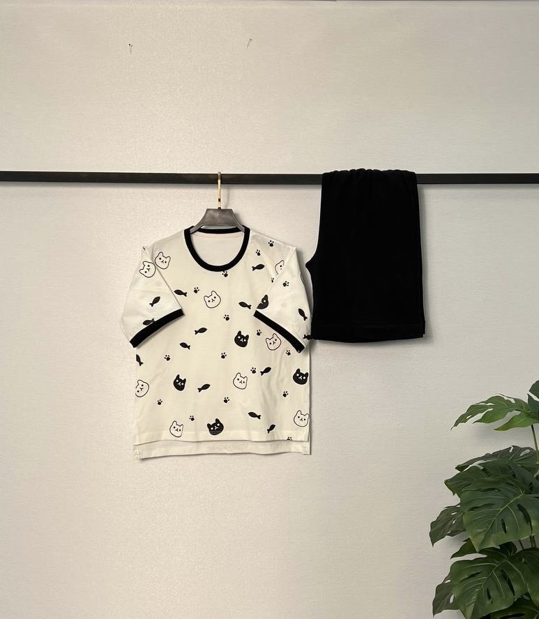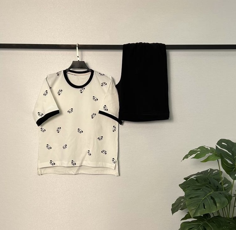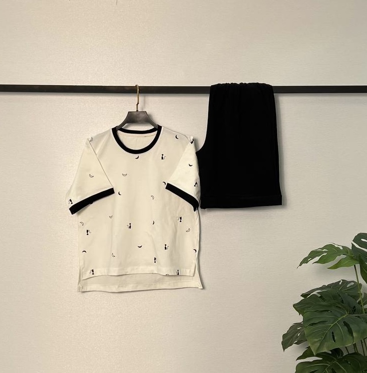 تیشرت شلوارک نخ پنبه بدون ذره ای مواد پلاستیکی پایین شلورک دوخت پاکتی دارد فری سایز۳۶/۴۴ دور سینه در حالت عادی۱۰۲ قد جلو تیشرت۵۳ قد پشت تیشرت۵۸ دور ران۶۶ قد شلوارک۵۱